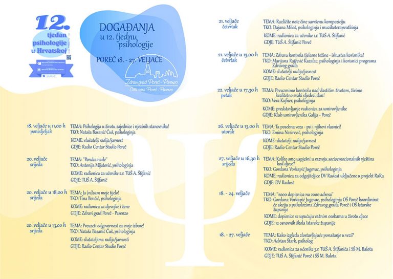 18.02. u 11,00 ponedjeljak Tema: Psihologija u životu zajednice i njezinih stanovnika! Tko: Nataša Basanić Čuš, psihologinja Kome: slušateljima radija/javnost Gdje: Radio Centar Studio Poreč…